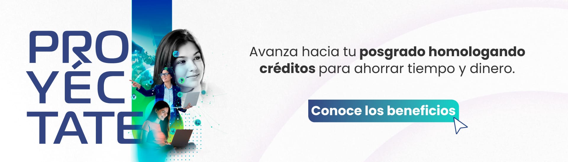 El Programa Proyéctate de la Universidad Ean se creó como apoyo a los estudiantes actuales y graduados, para que tengan la posibilidad de obtener un nuevo título homologando cierta cantidad de créditos; así podrán realizar una especialización, maestría o doctorado según corresponda, en menos tiempo y ahorrando dinero.